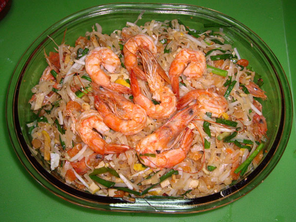 ตั้งกระทะให้ร้อนใส่น้ำมันเล็กน้อยนำกุ้งลงผัดพอสุกตักขึ้นเตรียม ไว้ ใส่เส้นลงผัด ค่อยๆ เติมน้ำซอสผัดให้เข้ากันใช้ไฟกลาง ในระหว่างผัดเติมน้ำเล็กน้อยเพื่อให้เส้นสุกนุ่ม ชิมรสถ้ายังไม่เข้มข้นให้เติมน้ำซอสเพิ่ม ก่อนยกขึ้นเร่งไฟใส่กุ้งที่เตรียมไว้ ถั่วงอก และต้นหอมคลุกให้เข้ากัน ตักใส่จานกินคู่กับผักสด ส้มตำไทย หรือ ส้มตำอีสานตามชอบ